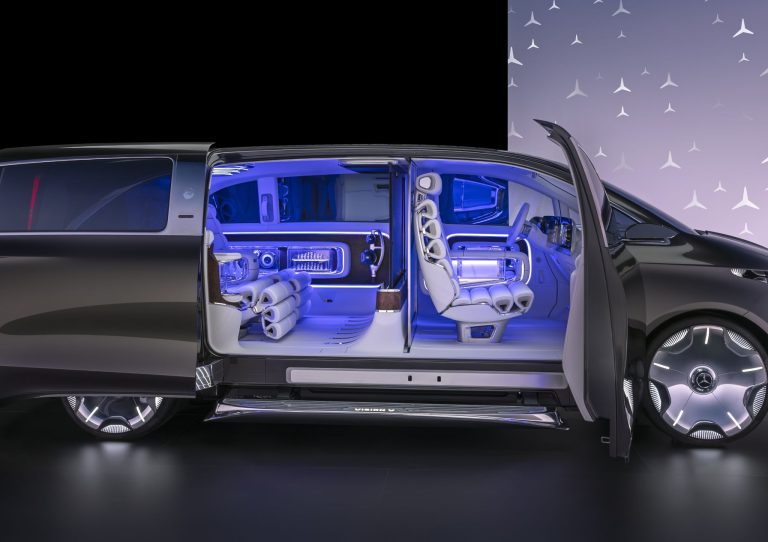 Ahora bien, es al adentrarnos en el Vision V donde la propuesta cobra todo su sentido. El interior se concibe como un salón abierto, casi un refugio. El acceso mismo ya es una declaración: una enorme puerta tipo “portal” en el lado derecho se abre automáticamente, mientras un estribo iluminado y retráctil facilita la entrada al área trasera, bautizada como “Private Lounge”.