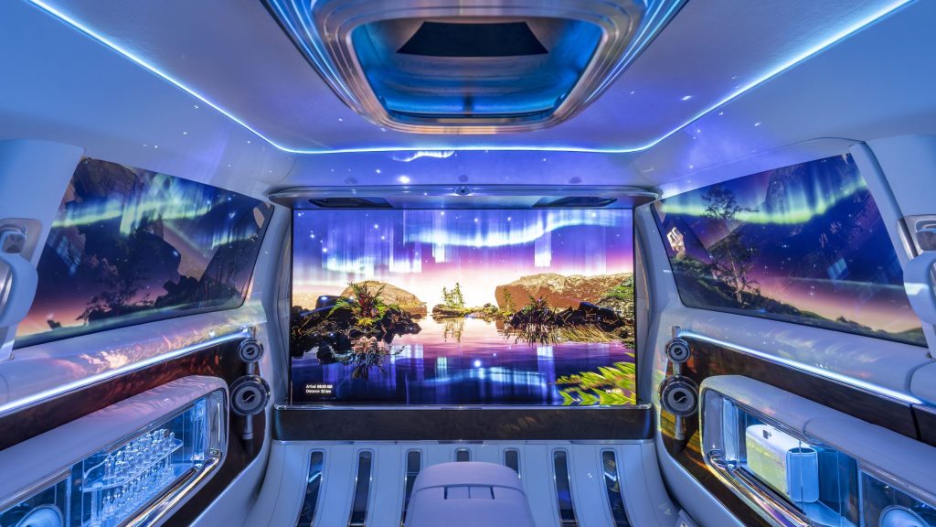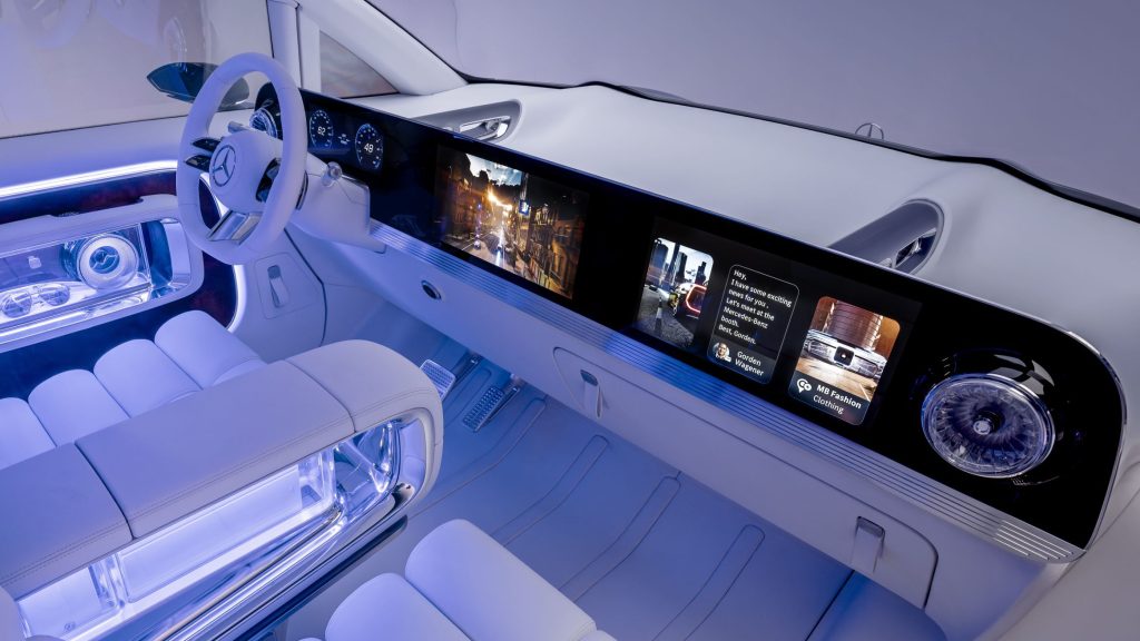 Mercedes propone siete “mundos de experiencia” interactivos para personalizar el viaje: desde entretenimiento (películas, música), relajación (paisajes relajantes, asientos reclinados), juegos (con mando incluido), trabajo (herramientas de oficina, asistente personal), compras interactivas, descubrimiento (navegación envolvente con realidad aumentada) y hasta un modo karaoke. Así pues, el viaje deja de ser un mero traslado para convertirse en una vivencia personalizable y profundamente tecnológica. El puesto de conducción no se queda atrás, con una “Superscreen” que abarca tres pantallas de pilar a pilar, ofreciendo una interfaz personalizable y acceso a toda la información relevante en tiempo real.