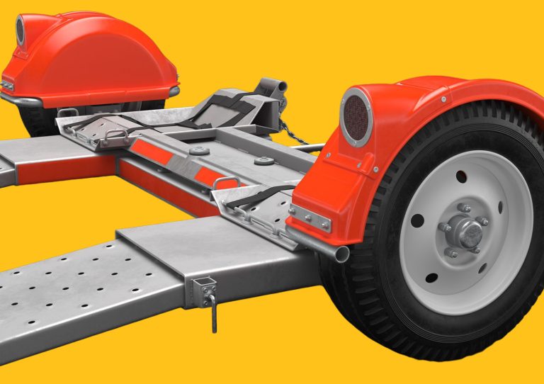Para quien no esté familiarizado, un tow dolly es un pequeño remolque de dos ruedas diseñado para levantar el eje delantero de un vehículo. El concepto es bastante directo: las ruedas delanteras del auto que se va a remolcar se suben y aseguran sobre la plataforma del dolly, mientras que las ruedas traseras permanecen en contacto con el asfalto, girando libremente durante el trayecto.